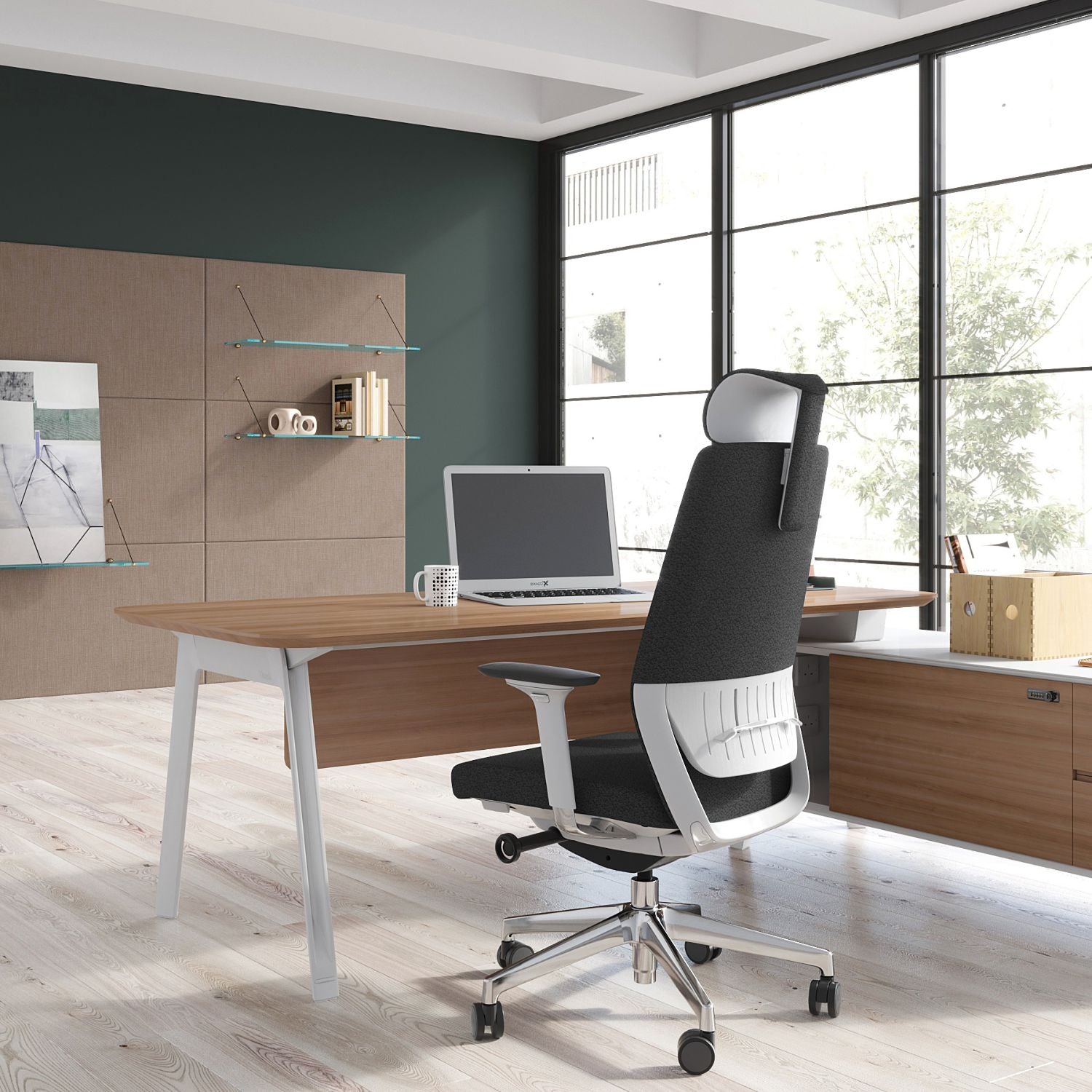 Diseñada para líderes que pasan largas horas tomando decisiones. Equilibrio perfecto entre diseño moderno y funcionalidad. Respaldo ergonómico alto con malla transpirable, soporte lumbar dinámico y apoyacabeza ajustable. Mecanismo sincronizado, asiento con espuma de alta densidad y apoyabrazos ajustables 3D. Con base de Nylon negra o de aluminio pulido, una silla que combina presencia, confort y prestigio.