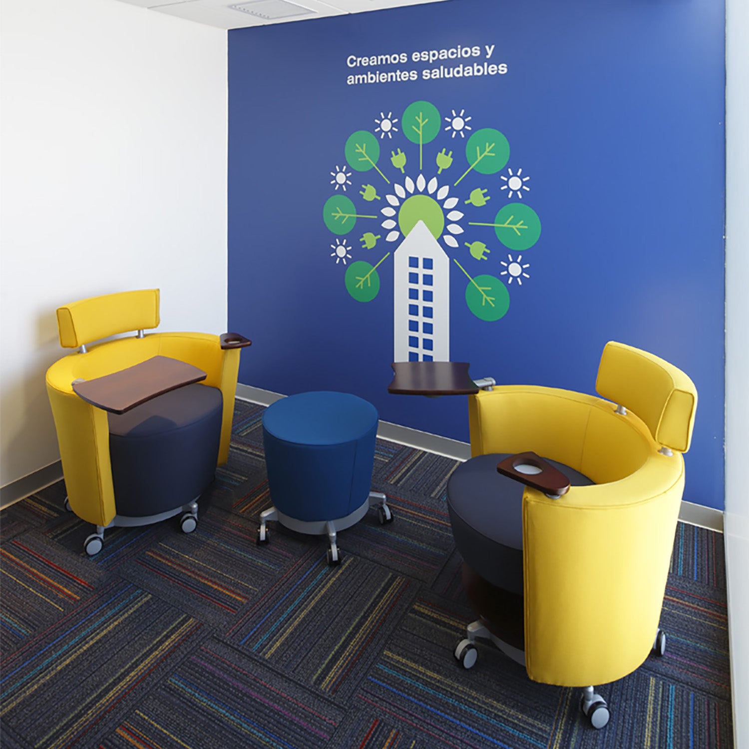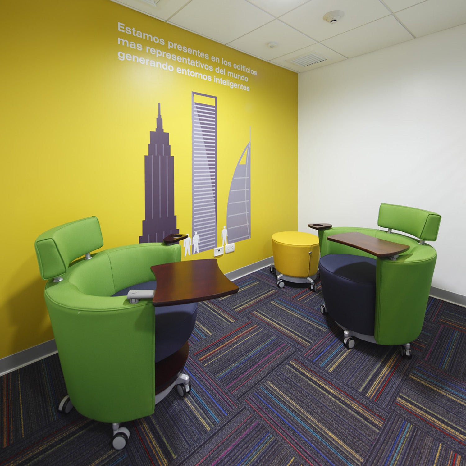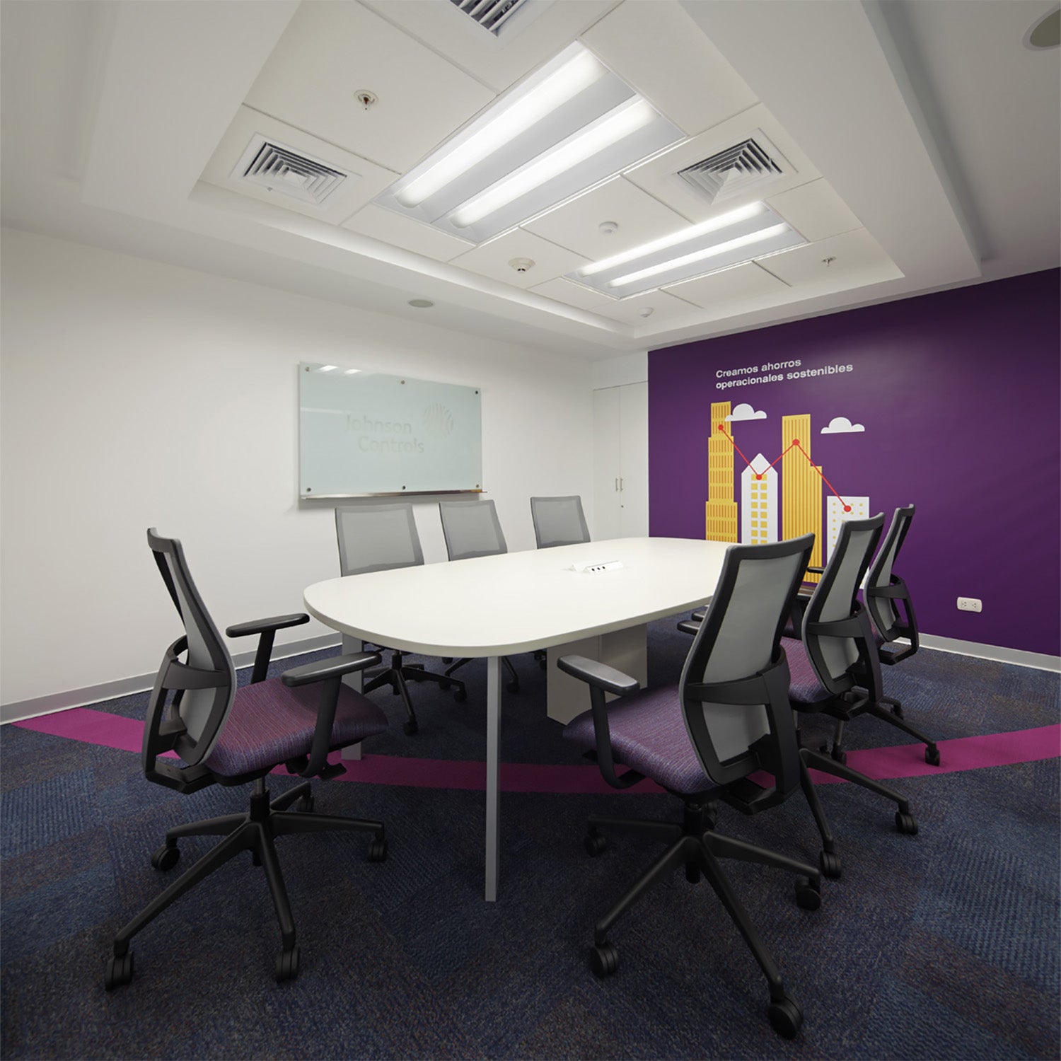 Diseño e implementación de una oficina compuesta por: más de 40 puestos de trabajo con paneles, áreas de espera y reuniones informales, escritorios gerenciales, utilizando diferentes productos de la marca Haworth: sistema de oficina, escritorios, sillas de trabajo y de visitas, mesas de madera y soft-seating.