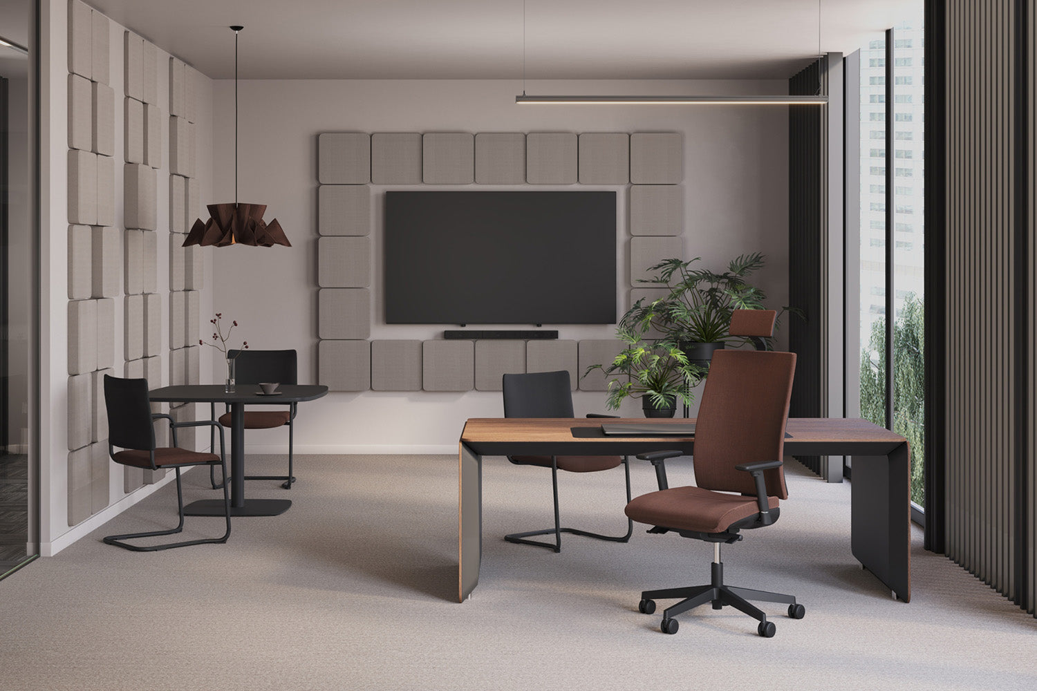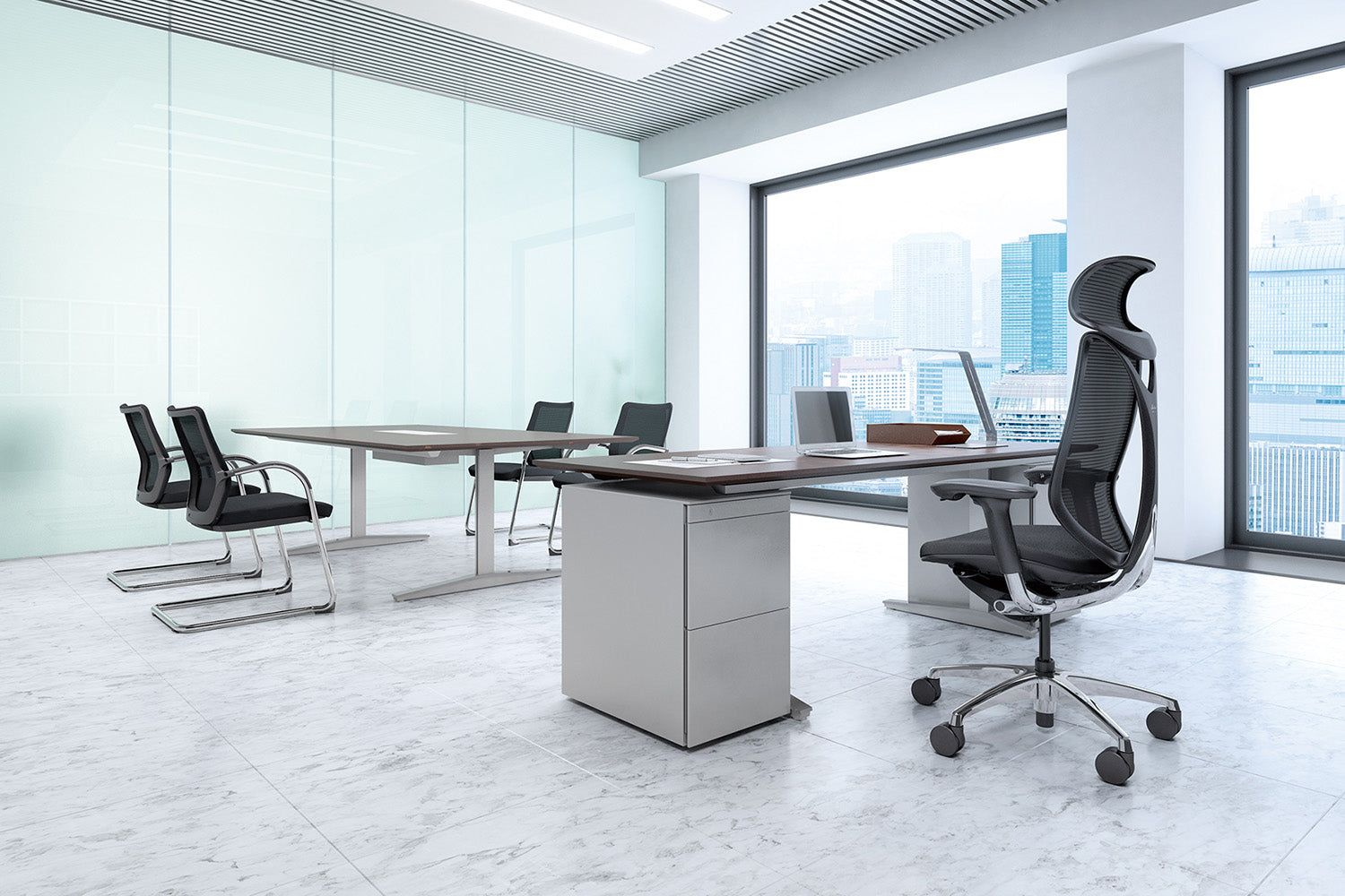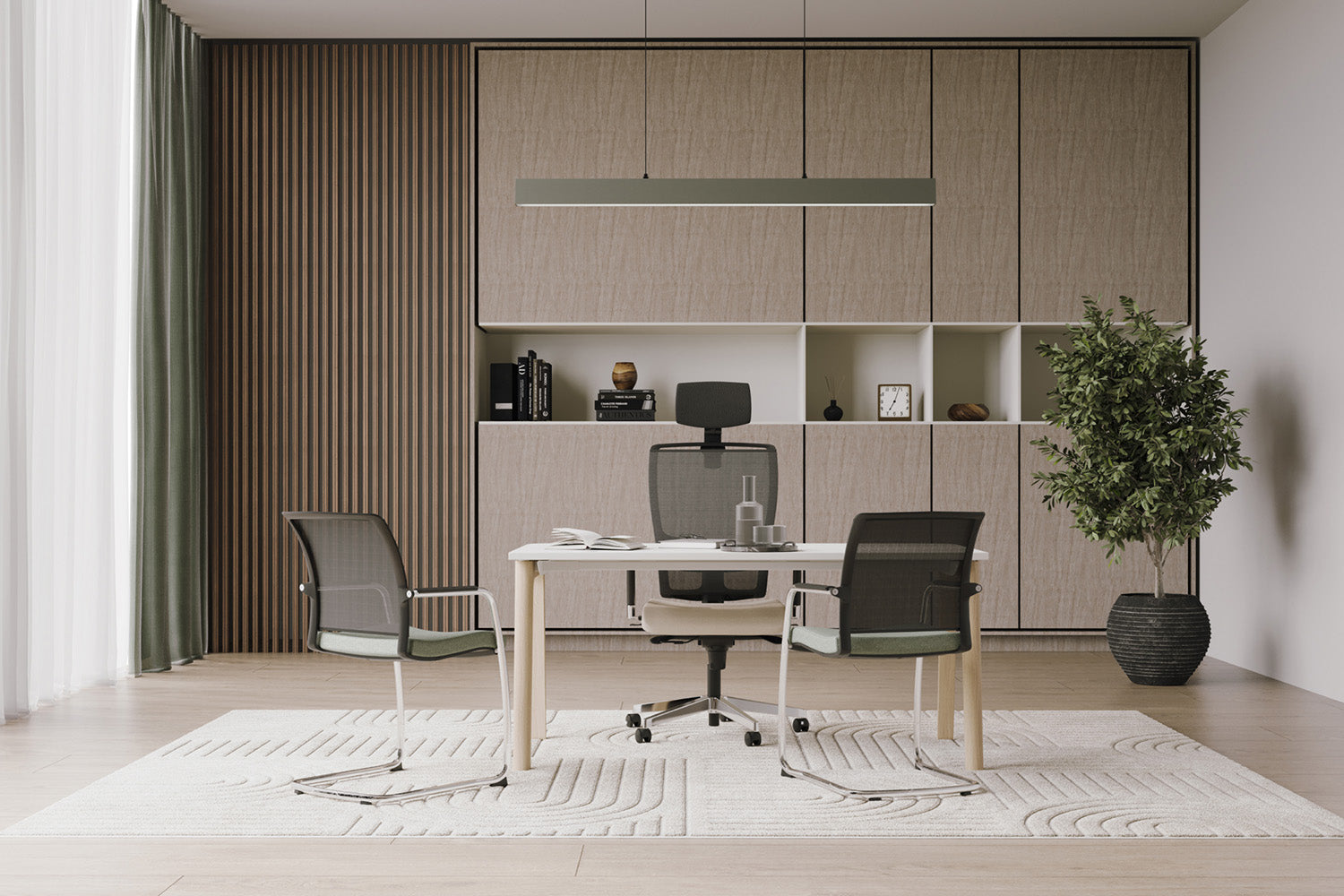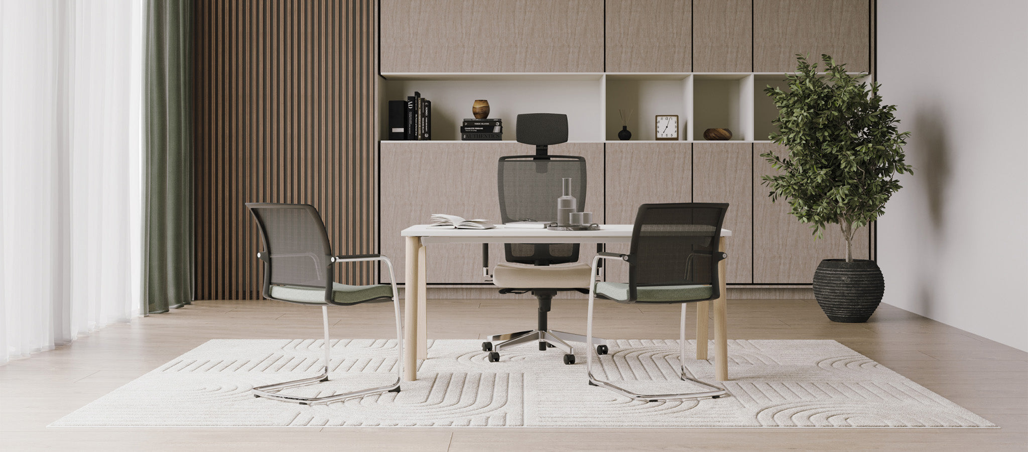 Un equilibrio entre confort y autoridad para largas jornadas de enfoque y decisiones.
